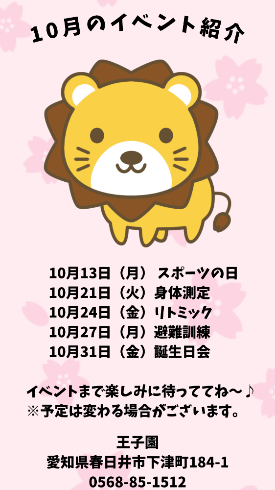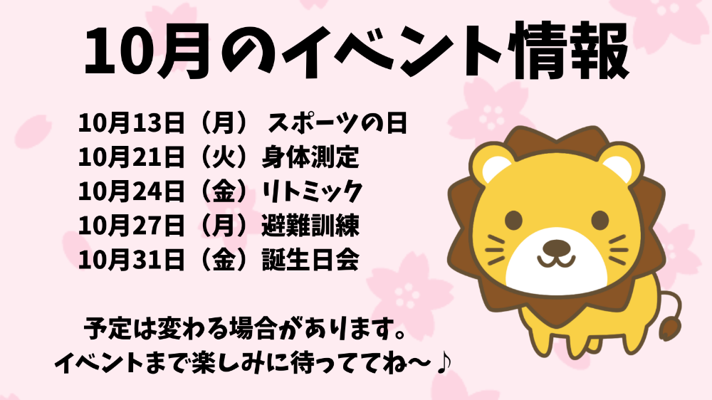 10月13日(月) スポーツの日10月21日(火)身体測定10月24日(金)リトミック10月27日(月)避難訓練10月31日(金)誕生日会イベントまで楽しみに待っててね〜♪※予定は変わる場合がございます。Instagram &X(旧Twitter)でも配信していますが、保護者様の皆様に便利に使って頂きたいとの想いで毎月制作しています♪縦と横どちらでも構いません。ダウンロードしてお使い下さい。是非、画像を保存して毎月イベントをチェックしましょう♪