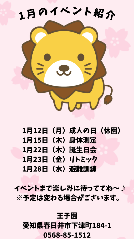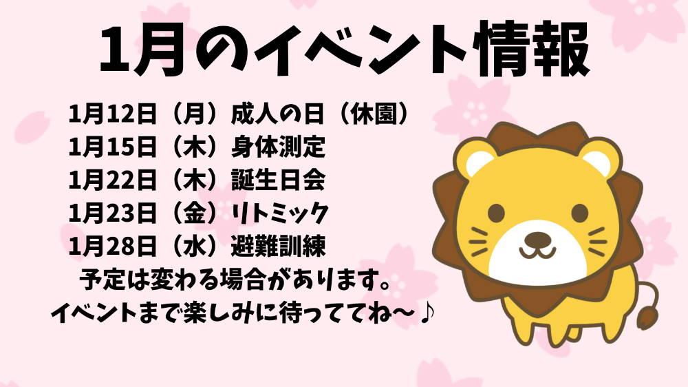 1月12日(月)成人の日(休園) 1月15日(木)身体測定1月22日(木)誕生日会1月23日(金)リトミック1月28日(水)避難訓練※予定は変わる場合があります。イベントまで楽しみに待っててね〜♪Instagram &X(旧Twitter)でも配信していますが、保護者様の皆様に便利に使って頂きたいとの想いで毎月制作しています♪縦と横どちらでも構いません。ダウンロードしてお使い下さい。是非、画像を保存して毎月イベントをチェックしましょう♪