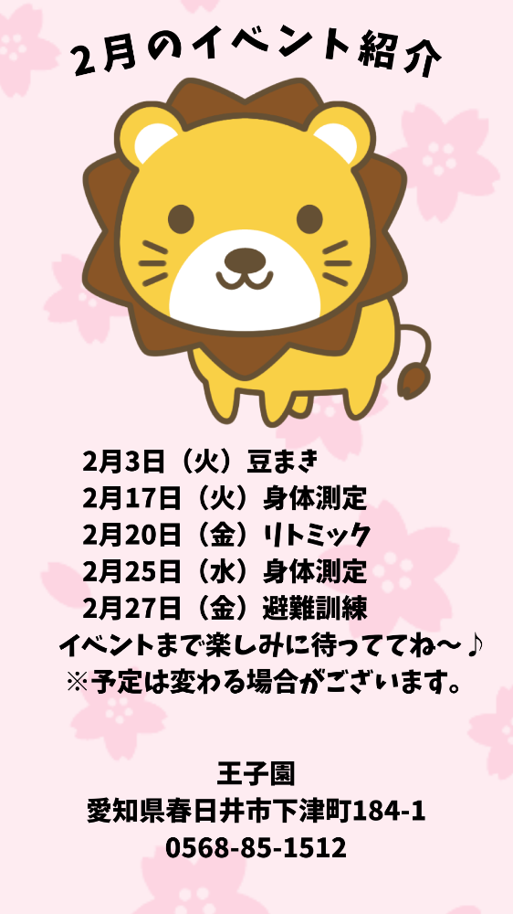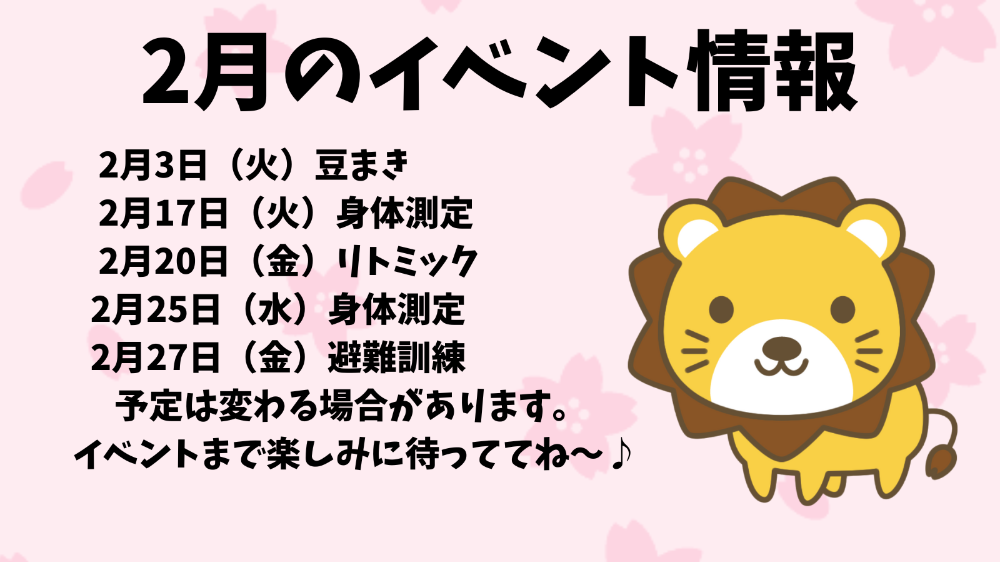 2月3日(火)豆まき2月17日(火)身体測定2月20日(金)リトミック2月25日(水)身体測定2月27日(金)避難訓練※予定は変わる場合があります。イベントまで楽しみに待っててね〜♪Instagram &X(旧Twitter)でも配信していますが、保護者様の皆様に便利に使って頂きたいとの想いで毎月制作しています♪縦と横どちらでも構いません。ダウンロードしてお使い下さい。是非、画像を保存して毎月イベントをチェックしましょう♪
